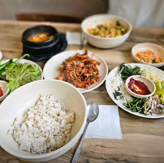 특징: 십여 가지의 나물을 넣고 슥슥 비벼 먹는 보리밥과 매콤 달콤하게 구워낸 코다리구이가 환상의 짝꿍입니다. 직접 띄운 청국장 찌개도 함께 제공되어 깊은 풍미를 느낄 수 있습니다.
