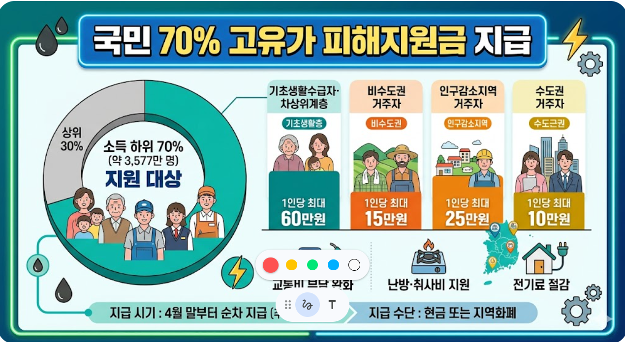 최근 중동 전쟁 여파로 기름값이 급등하면서 서민 경제의 부담이 커지고 있습니다. 정부는 이를 해결하기 위해 **'소득 하위 70%'**